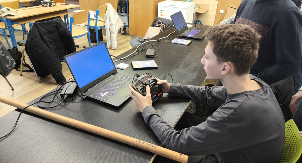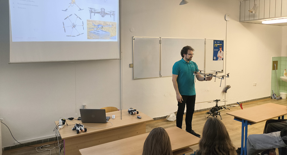 Workshop „Den s drony“ začal krátkou, ale výstižnou přednáškou o vývoji bezpilotních prostředků – od prvních experimentů až po současné využití v praxi. Poté následovala část, která žáky chytila okamžitě: simulátory velkých dronů, kde si každý mohl bezpečně vyzkoušet základní ovládání a orientaci v prostoru. Následně jsme se přesunuli k malým dronům v učebně, kde si žáci zkusili i reálný let v kontrolovaných podmínkách. Jako bonus byly připraveny i modely aut na dálkové ovládání, takže o smích a radost z „řízení“ nebyla nouze.