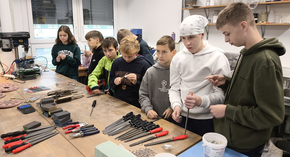 Druhý blok nesl název „Můj první odlitek“ a byl postavený hlavně na praxi. Po úvodní prezentaci jsme zamířili do laboratoře, kde si žáci pod dohledem vyzkoušeli princip odstředivého odlévání: vložení formy do odstředivky a následně i lití roztaveného hliníku do formy. Hotové odlitky si pak každý ručně obrousil a vyleštil, takže si domů odnesl nejen zážitek, ale i vlastní výrobek. Nejčastěji vznikaly malé „klíčenky“ s vánočními motivy i různými populárními tvary – největší úspěch ale měl otvírák na láhve, protože u něj si skoro každý hned vzpomněl na tatínka, strejdu nebo dědečka.